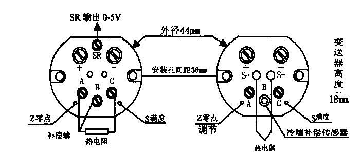 24VDC电源通过屏蔽电缆给变送器供电,“V+”接 24VDC的正极,“V-”接负极。将变送器接到标准信号源上(电阻箱或毫伏计),在信号源给出零点和满度信号时反复调整零点及满度电位器,即可精确调整量程。“Z”为零点调整电位器,“S”为满度调整电位器(所有电位器在出厂以前都已校好)。